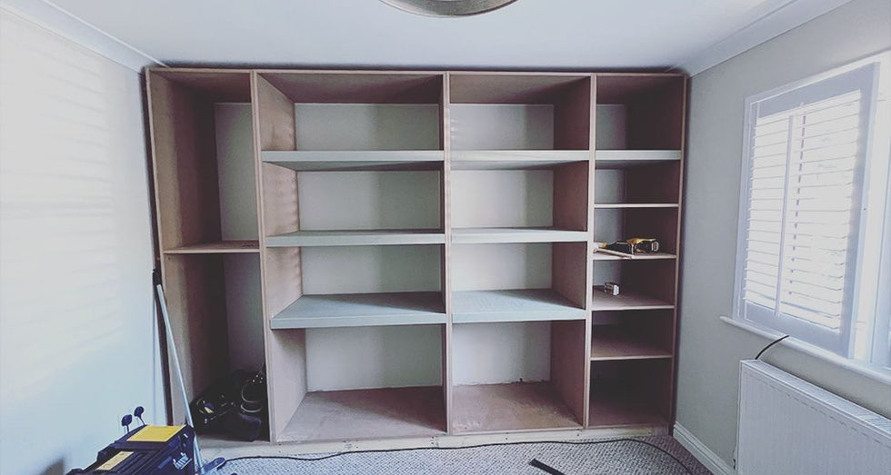 Handmade solid sapele hardwood bookcases Ryde, 2024 & wall to wall MDF storage unit, Wroxall 2022